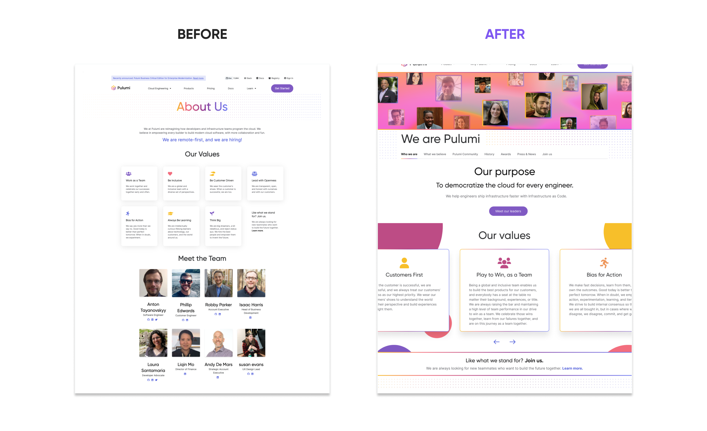 The original About page lacked essential storytelling. It didn’t communicate Pulumi’s mission, values, or history—and the visual presentation failed to reflect the personality of the company. Employee photos, once used to humanize the brand, had become unsustainable to maintain as the team scaled.