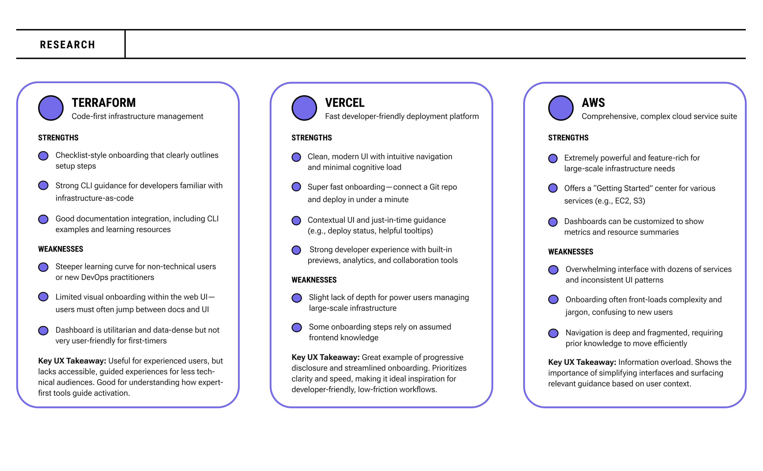To inform the design direction, I conducted a competitive review of several cloud and infrastructure platforms, including Terraform, AWS, env0, and Vercel. I focused on how these tools onboard new users, present data, and structure their dashboards.