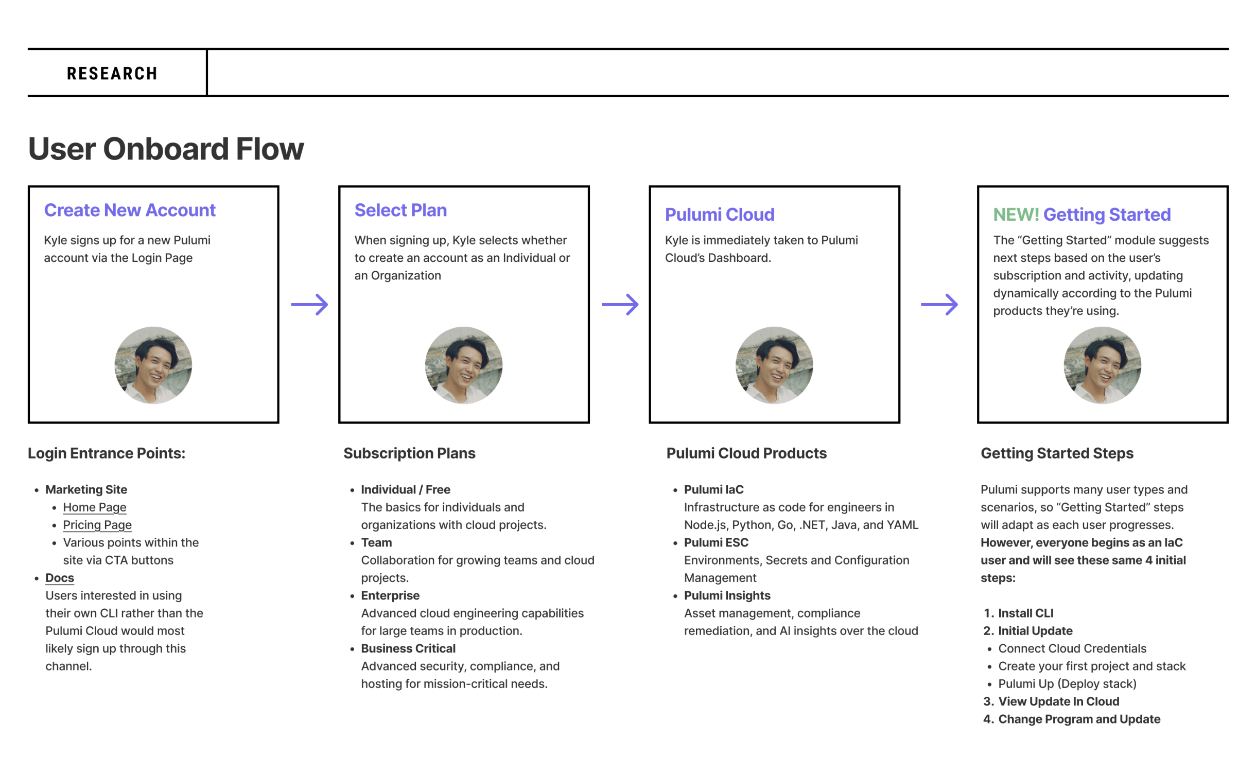 Through collaboration with the team in meetings and brainstorming sessions—as well as reviewing past user research, including defined personas and usability studies conducted by myself and other designers—I analyzed the current onboarding flow and identified areas for improvement. From this, I created a general User Onboarding Flow with the first three steps: Create New Account, Select Plan, and Pulumi Cloud—representing what users experience today. I also introduced a new fourth step: Getting Started, which features a dynamic module that suggests next steps based on the user’s subscription and activity. This module updates automatically according to the Pulumi products the user is actively using.